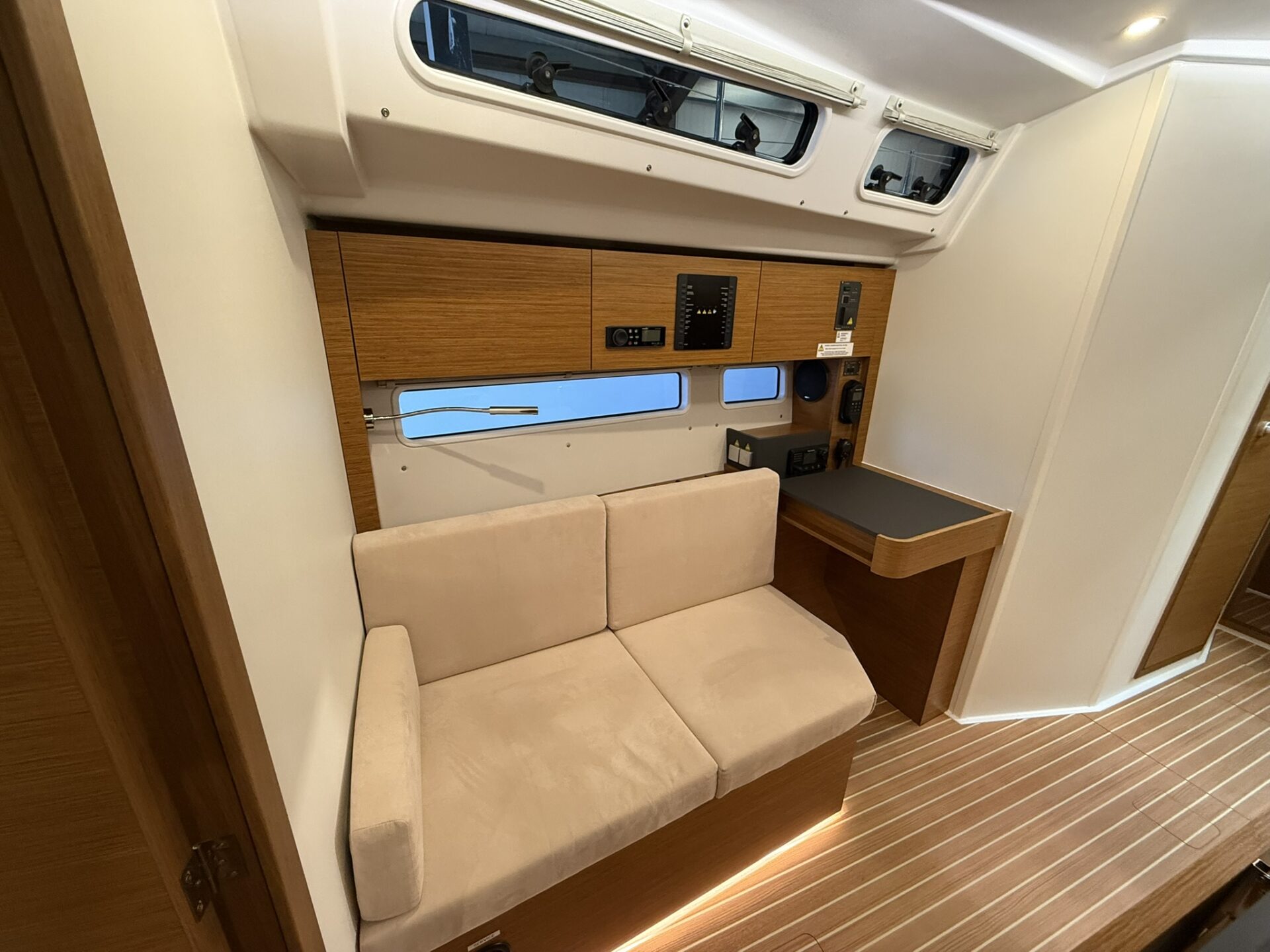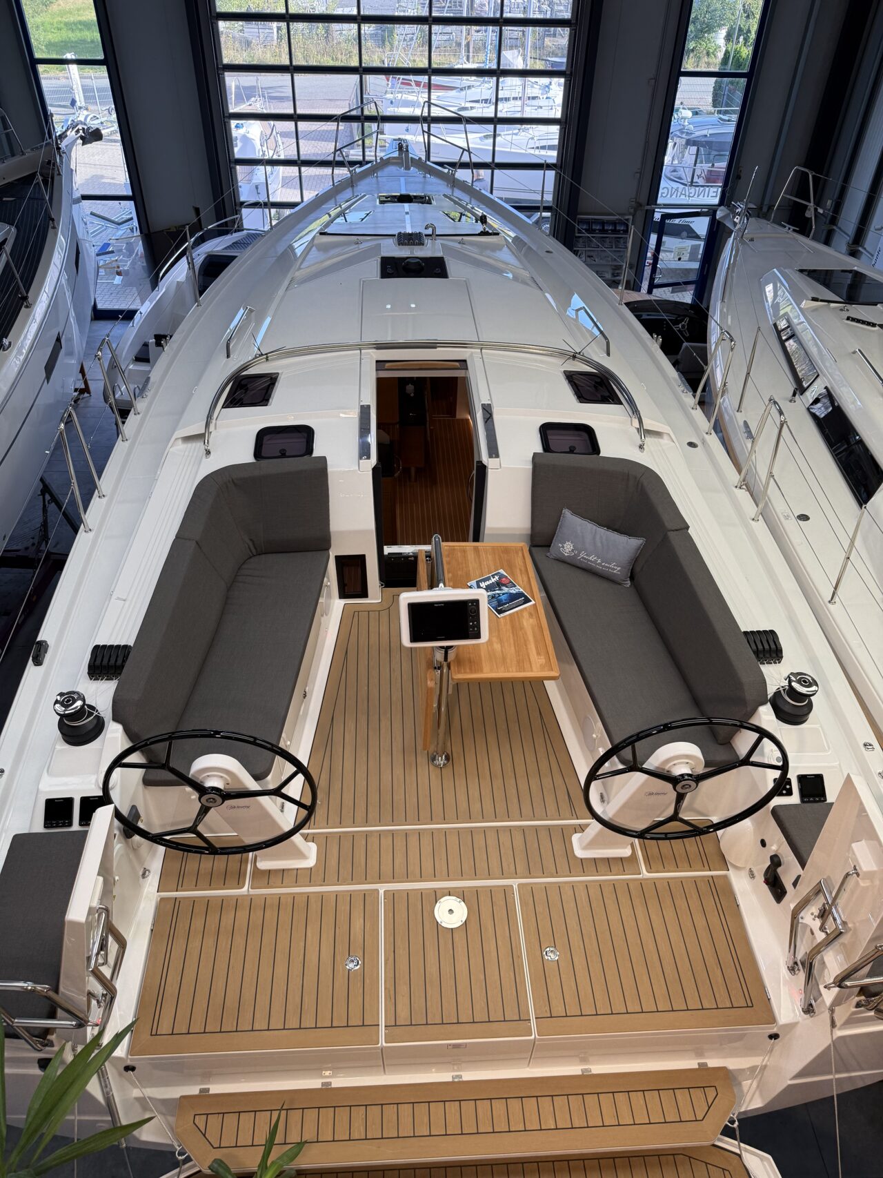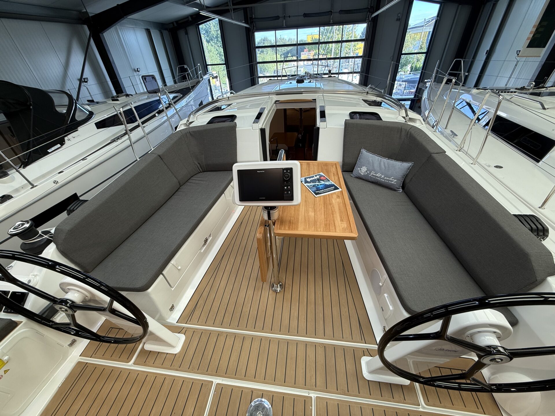 - Synthetisches Teak im Cockpit, auf Steuermannssitzen, Cockpitbänken und Badeplattform
