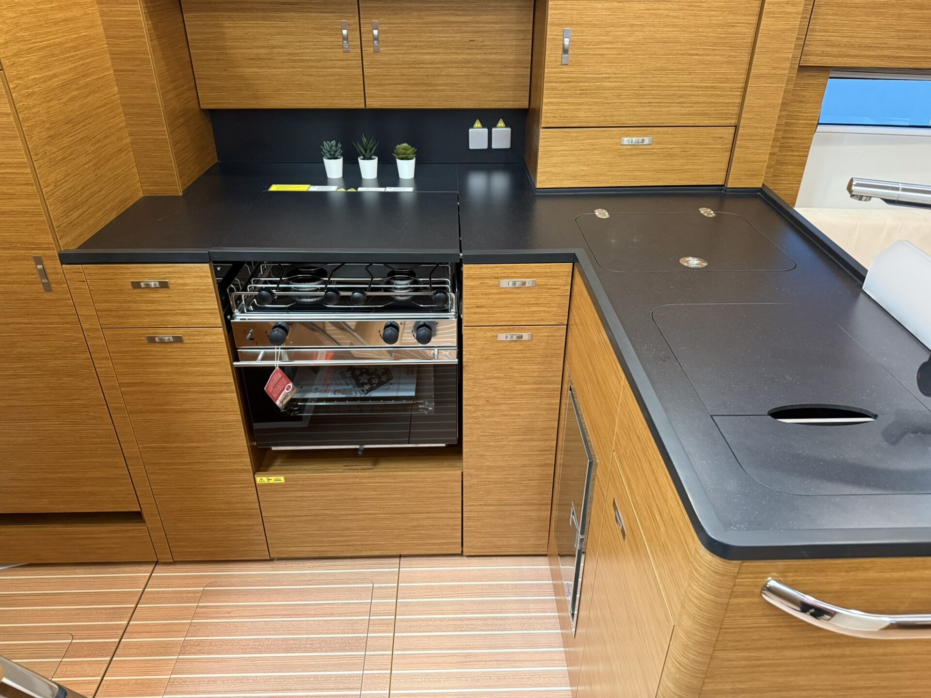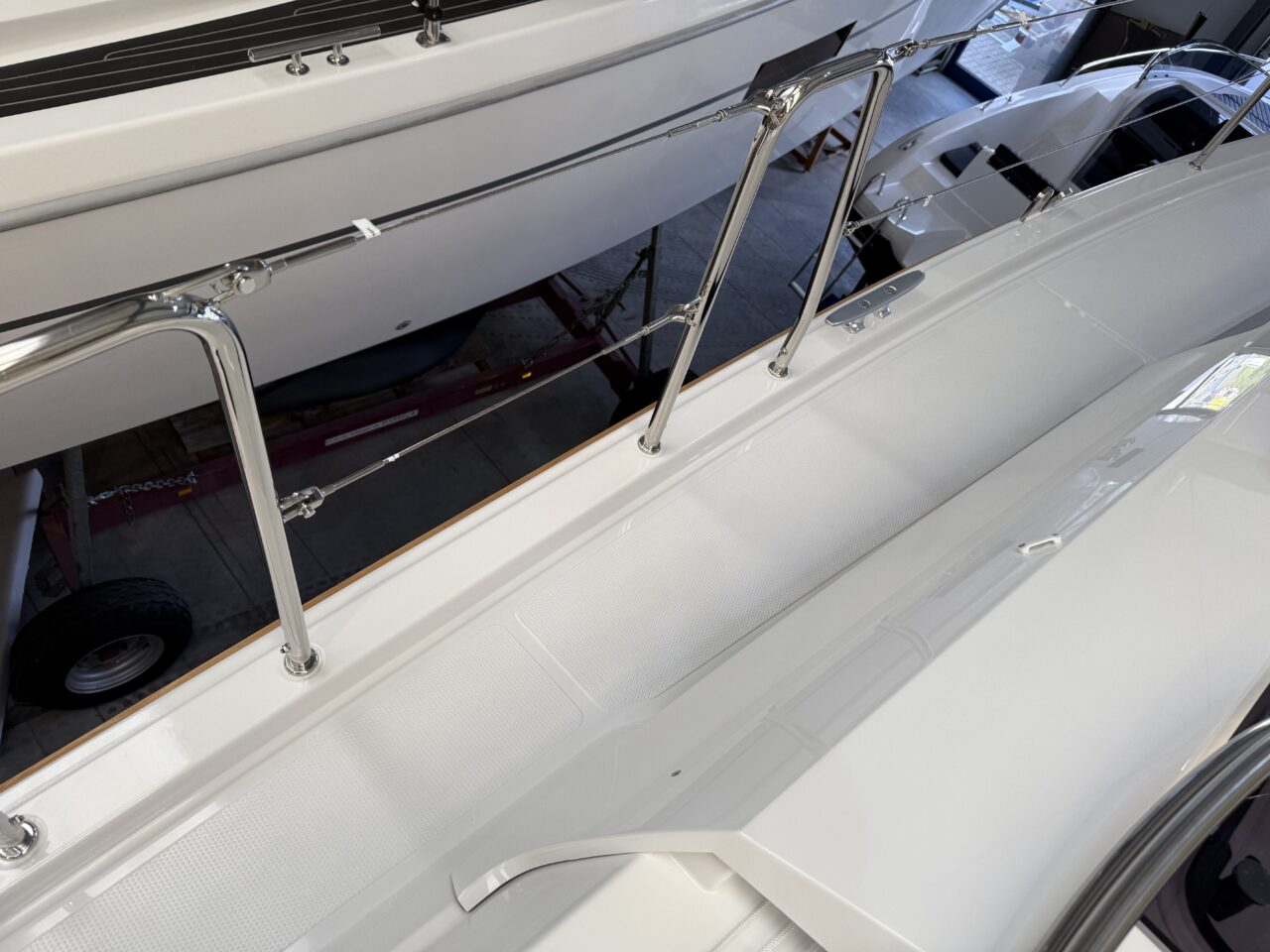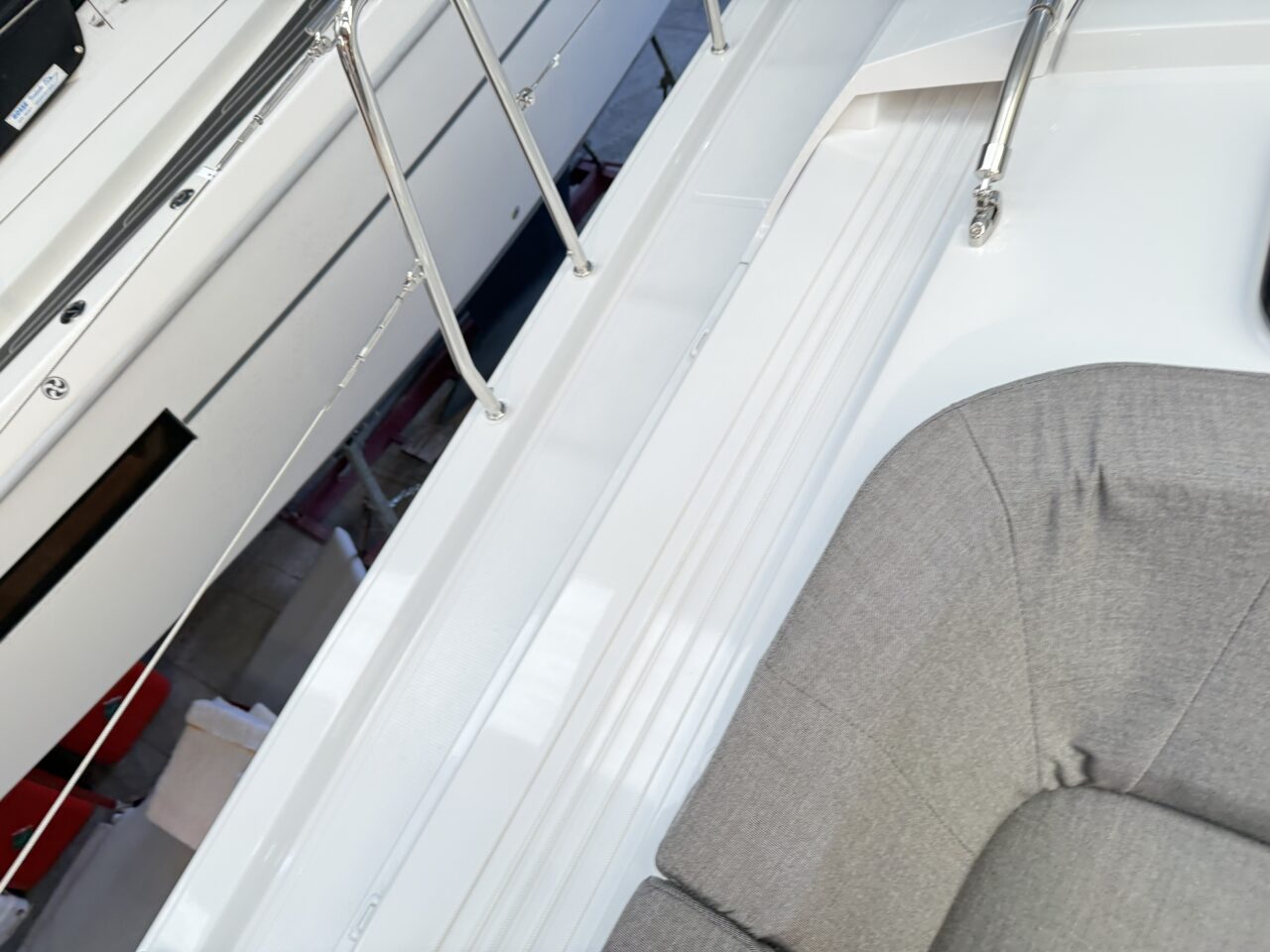 - Synthetisches Teak im Cockpit, auf Steuermannssitzen, Cockpitbänken und Badeplattform