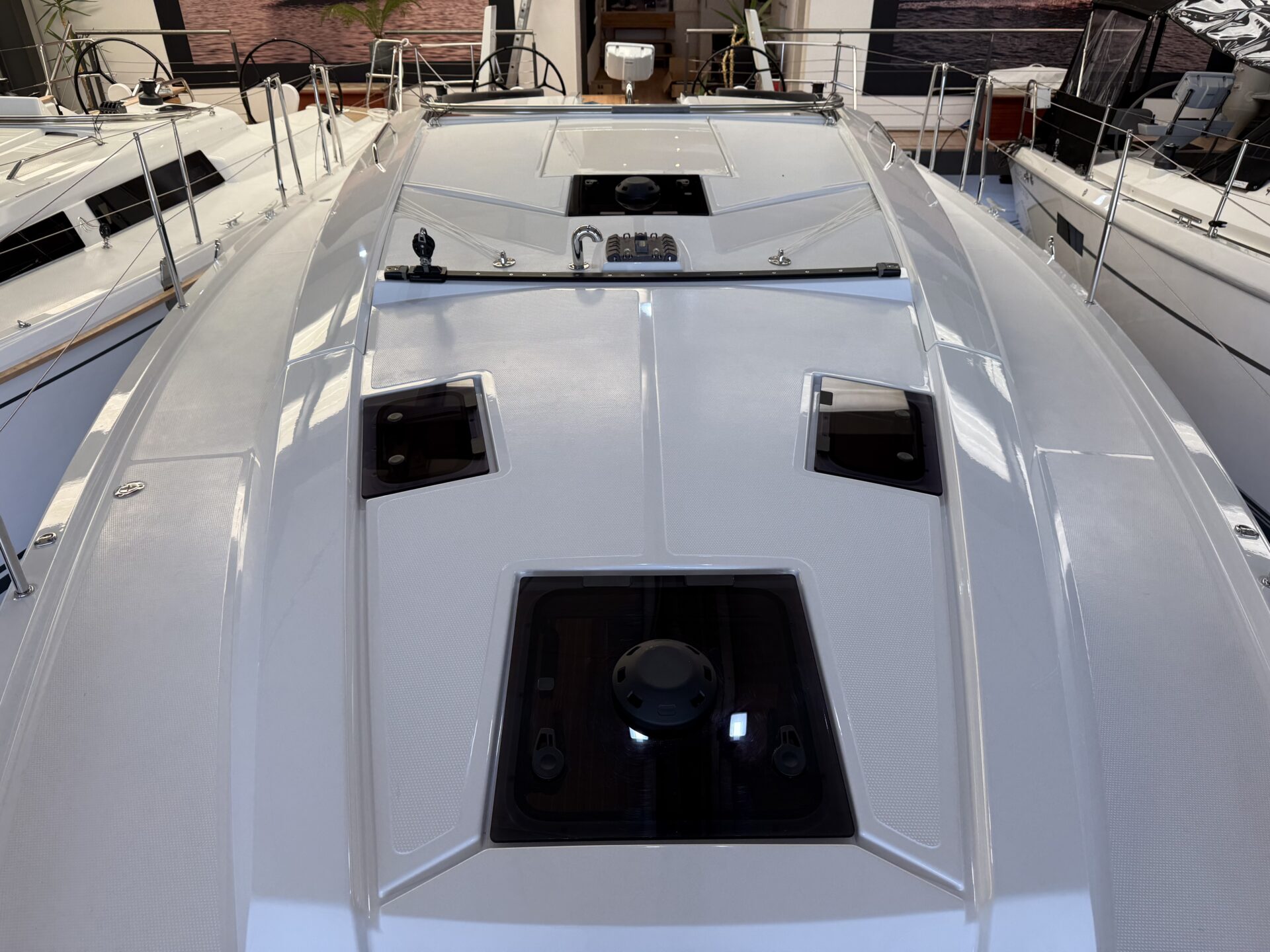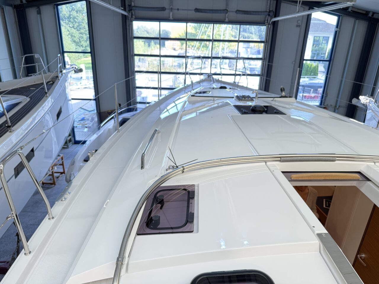 Unter Deck überzeugt die Hanse 360 mit einem hellen, modernen Interieur und einer großzügigen Raumaufteilung. Große Rumpf- und Decksfenster schaffen viel Tageslicht und eine offene, freundliche Atmosphäre. Hochwertige Materialien und klare Linien sorgen für eine wohnliche Umgebung an Bord.