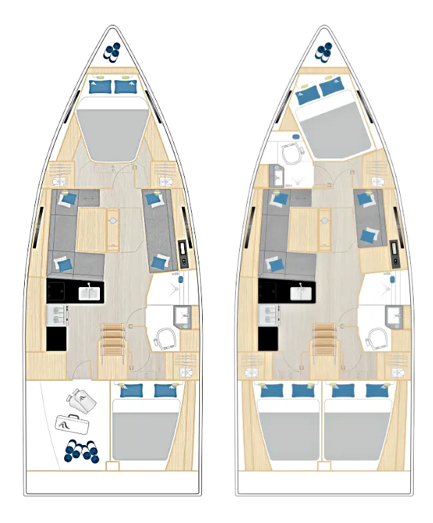 Unter Deck überzeugt die Hanse 360 mit einem lichtdurchfluteten, großzügigen Salon, der dank großer Fenster und Luken hervorragend belüftet wird. Die Raumgestaltung lässt sich individuell anpassen: Wahlweise steht ein klassischer Kartentisch oder ein vielseitiges Möbelstück mit zusätzlichem Kühlschrank zur Verfügung. Die weitläufige Eignerkabine bietet höchsten Komfort und verfügt über ein eigenes Bad – ideal für entspannte Tage und Nächte an Bord.