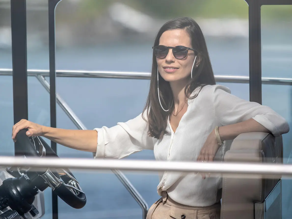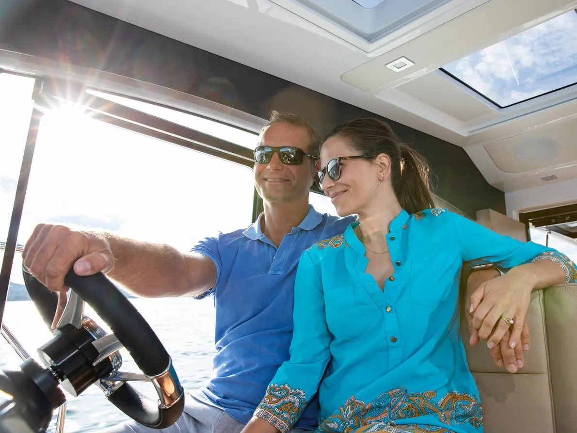 An Bord erwartet Sie exklusiver Komfort: Außengrill und hydraulische Badeplattform im Cockpit, zwei große Kühlschränke sowie ein komfortabler Beifahrersitz im Salon. Das innovative One-Level-Wohndesign mit vollständig zu öffnender Glasfront verbindet Innen- und Außenbereich nahtlos über die zentral platzierte Pantry.
